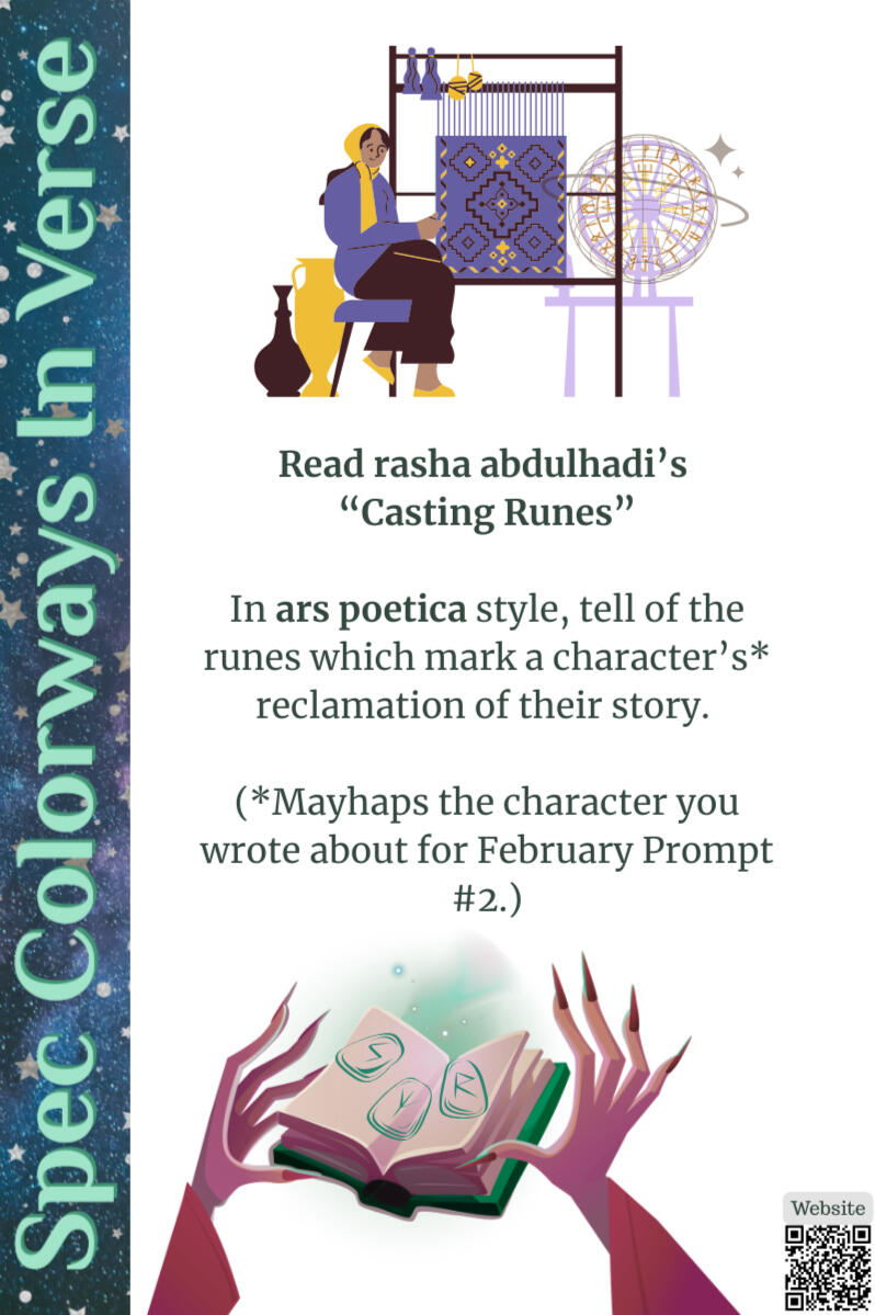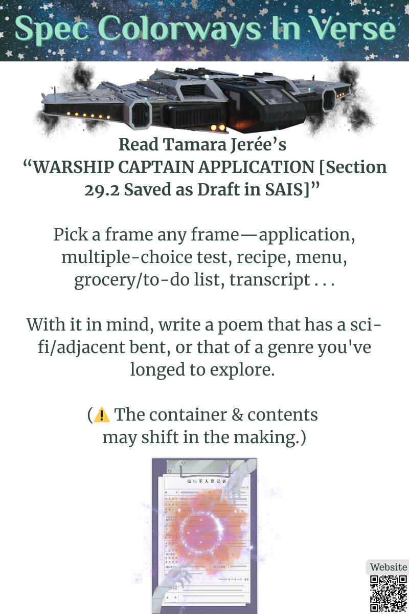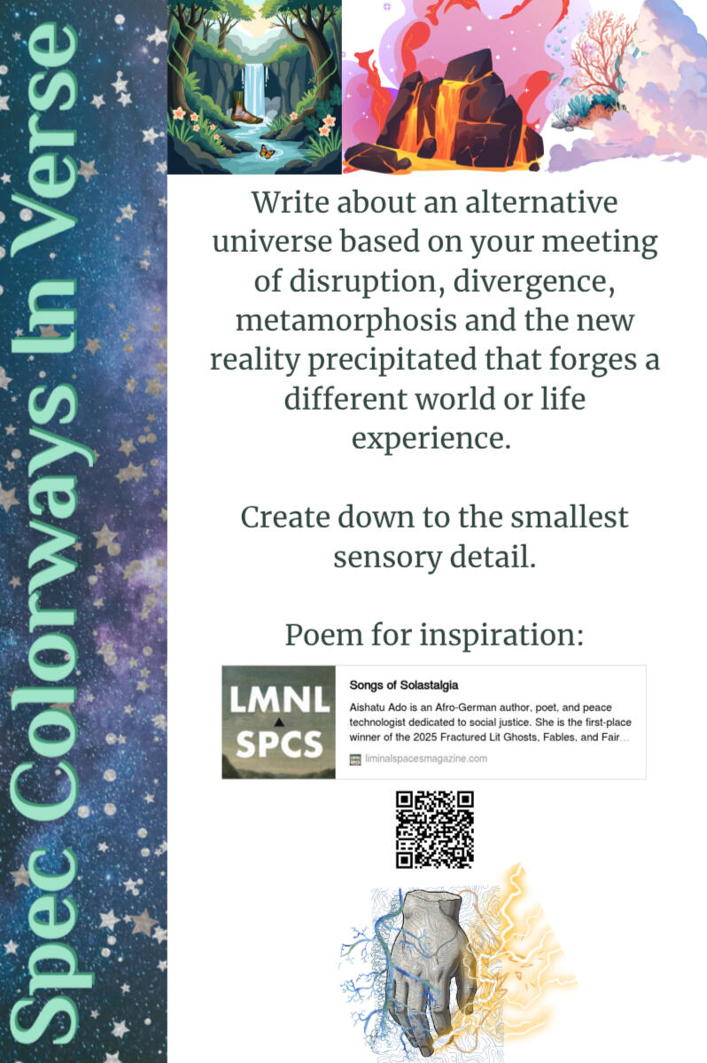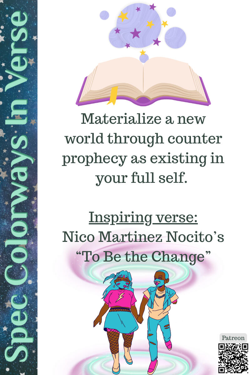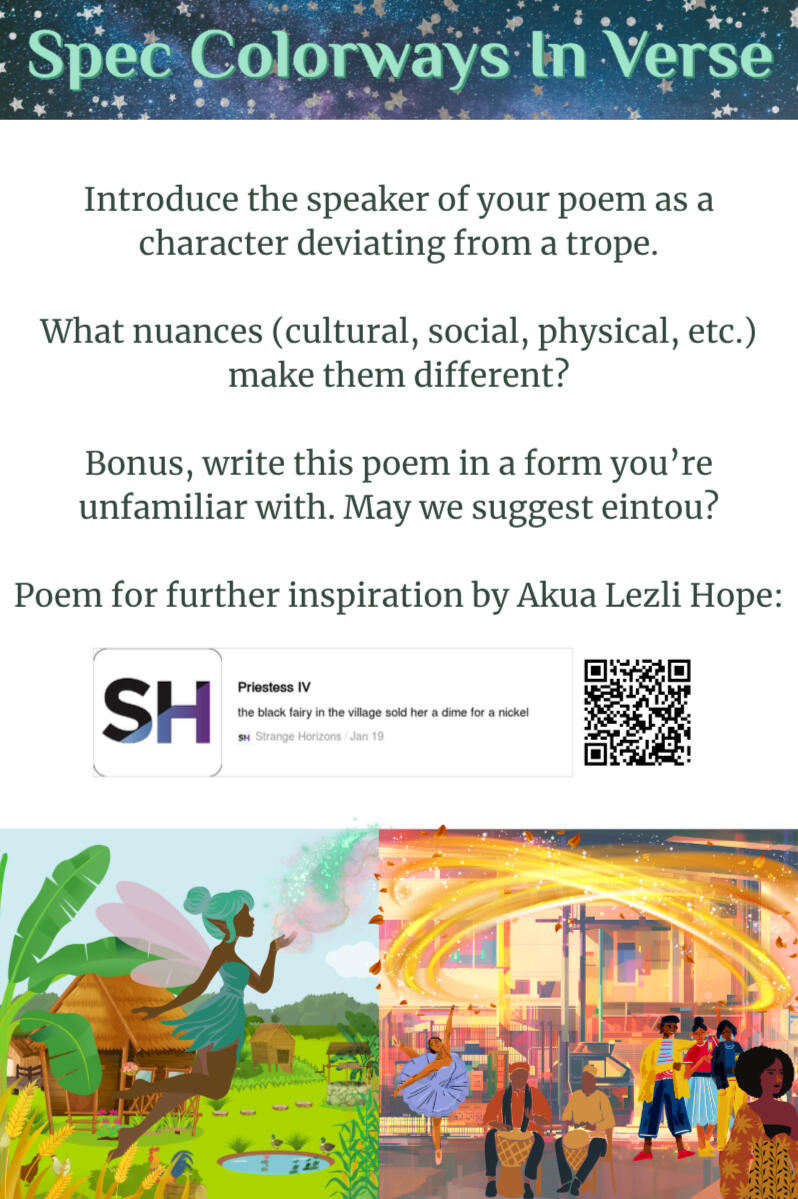 Spec Colorways In Verse is seeking prompt-inspired speculative poetry by queer Black, Indigenous, & People of Color (BIPOC)—for more deats, read our whys.2–3 poems, each begins on a new page and less than 25 lines per (6 max); if your heart, or energy, determines you have a single masterpiece, we’ll read it. Must be speculative—not “I glided into a portal” then the rest is unrelated and nonspeculative. We’re open to any form: traditional, free, experimental, and/or hybrid. We also encourage those living with (dis)abilities*/chronic illnesses and rooted in or of diasporas from Africa, Asia, SWANA, Central/South America, the Caribbean, the Pacific, and First Nations to submit work engaging with the cultures and stories of their communities—but it is not a requirement, we want whatever is forged from the depth of your creativity and wonder.Original content only.Simultaneous Submissions: Allowed. Please indicate if you’re submitting simultaneously in your cover letter, and notify us as soon as possible if your submission has been accepted somewhere else—or you need to withdraw for another reason (no explanation required)—so we can remove it from consideration.Payment is $50 per poem (USD): Paid on publication—primarily through PayPal, but will arrange other payment methods as necessary.Rights: First electronic rights (digital)—4 months of exclusivity from the date of publication on our Patreon, and indefinite archiving on our website unless the author requests to remove the content; an exemption to the period above is granted for reprinting of work in Year’s Best, other annuals/related volumes, author collections, and as otherwise agreed upon by both us and the author. If elect to include with your piece, nonexclusive right to record, or post recording of, audio and share it on our Patreon for at least a year.We Can’t Accept: Work that isn’t in English, because we don’t have the capacity or knowledge for translation. We will not be rating your engagement of English (e.g., dialects) in our decision, write your work how it yearns—if you can, read aloud, how does it feel?We’re Not Interested In: